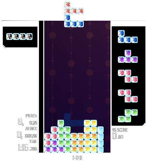 Meiri's Reverie is an action puzzle game focused on direct competition between players, combining two classic mechanics from the genre: the block stacking system, popularized by titles like Tetris/TETR.IO, and element-matching puzzles, inspired by games like Panel de Pon and Puzzle League.